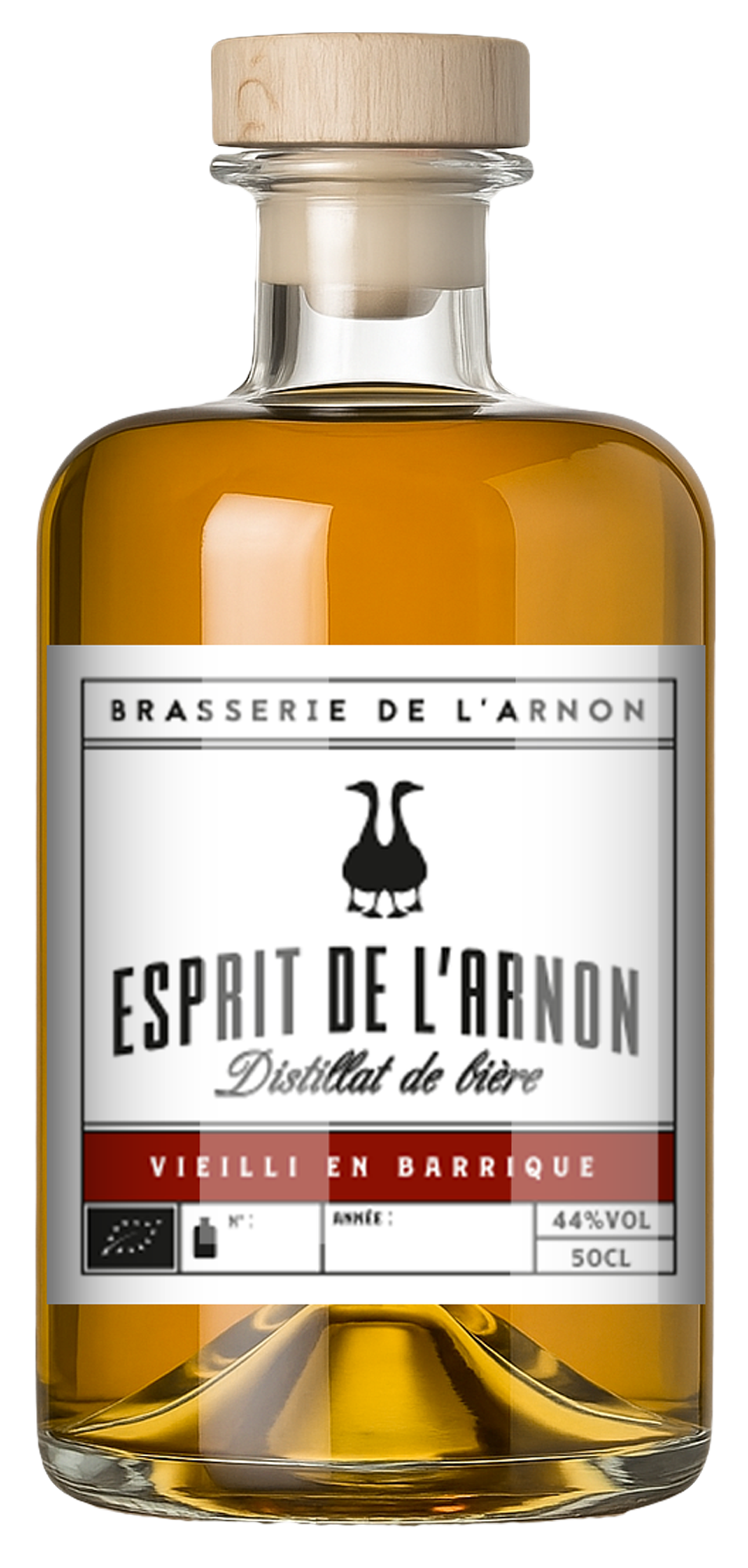 Afin de compléter la gamme, la brasserie élabore également depuis l’été 2018 un distillat de bière que l’on appelle « L’Esprit de l’Arnon ». Ce spiritueux est obtenu par distillation de nos bières et est vieilli plus de deux ans en fût de chêne.